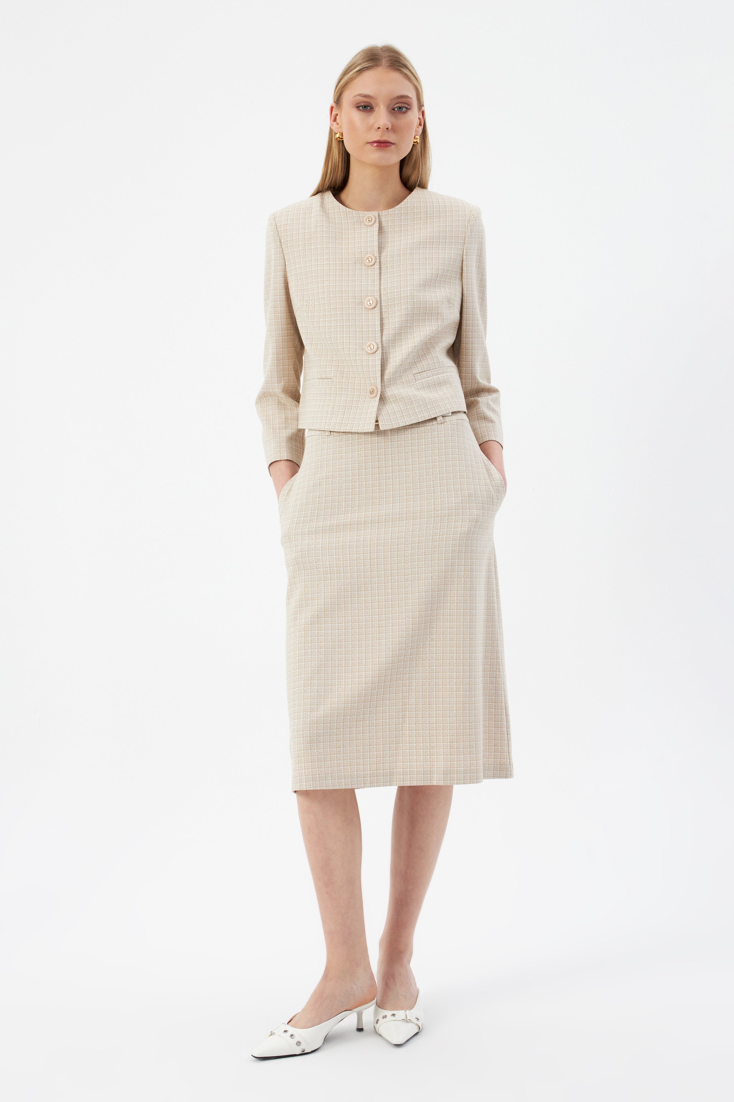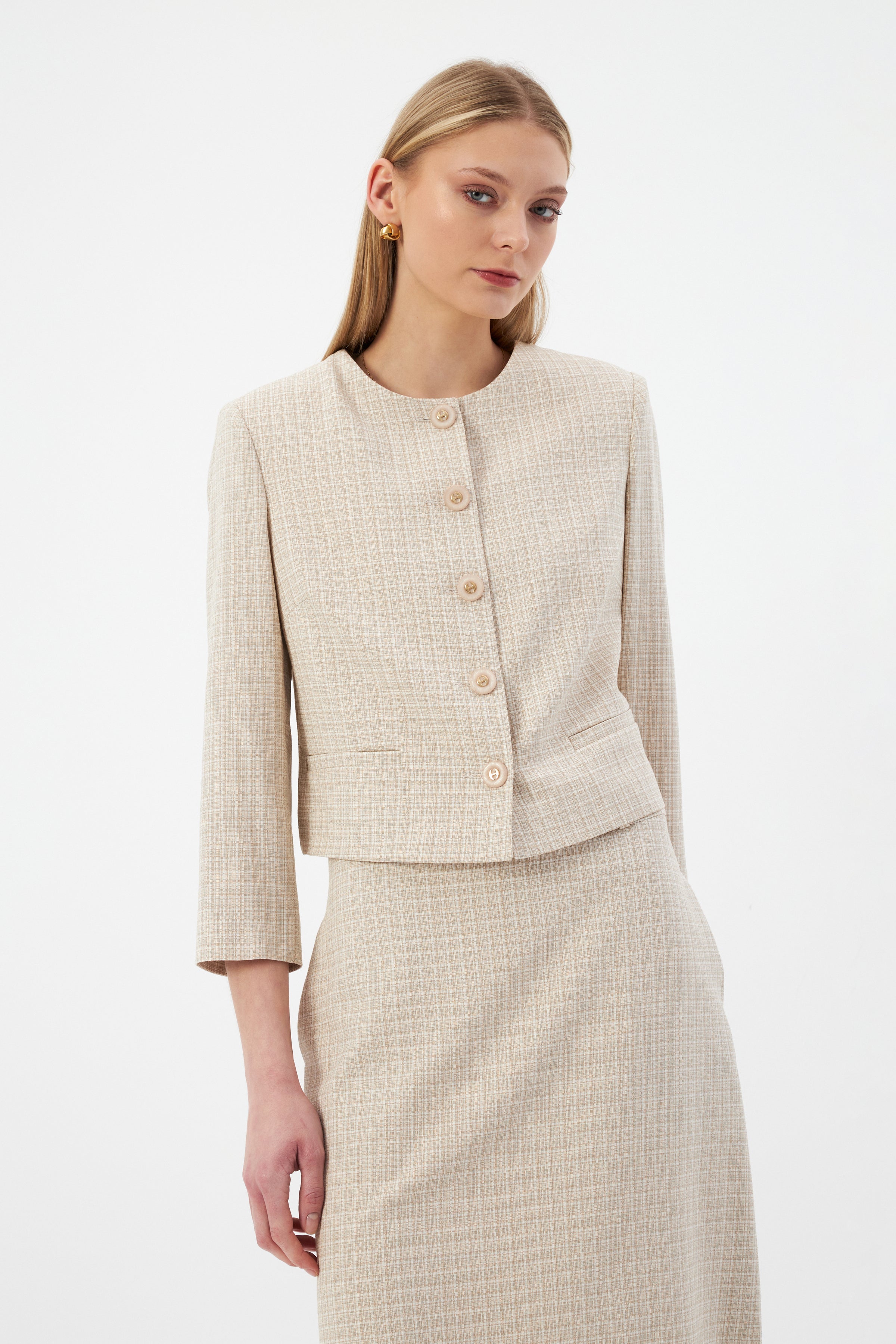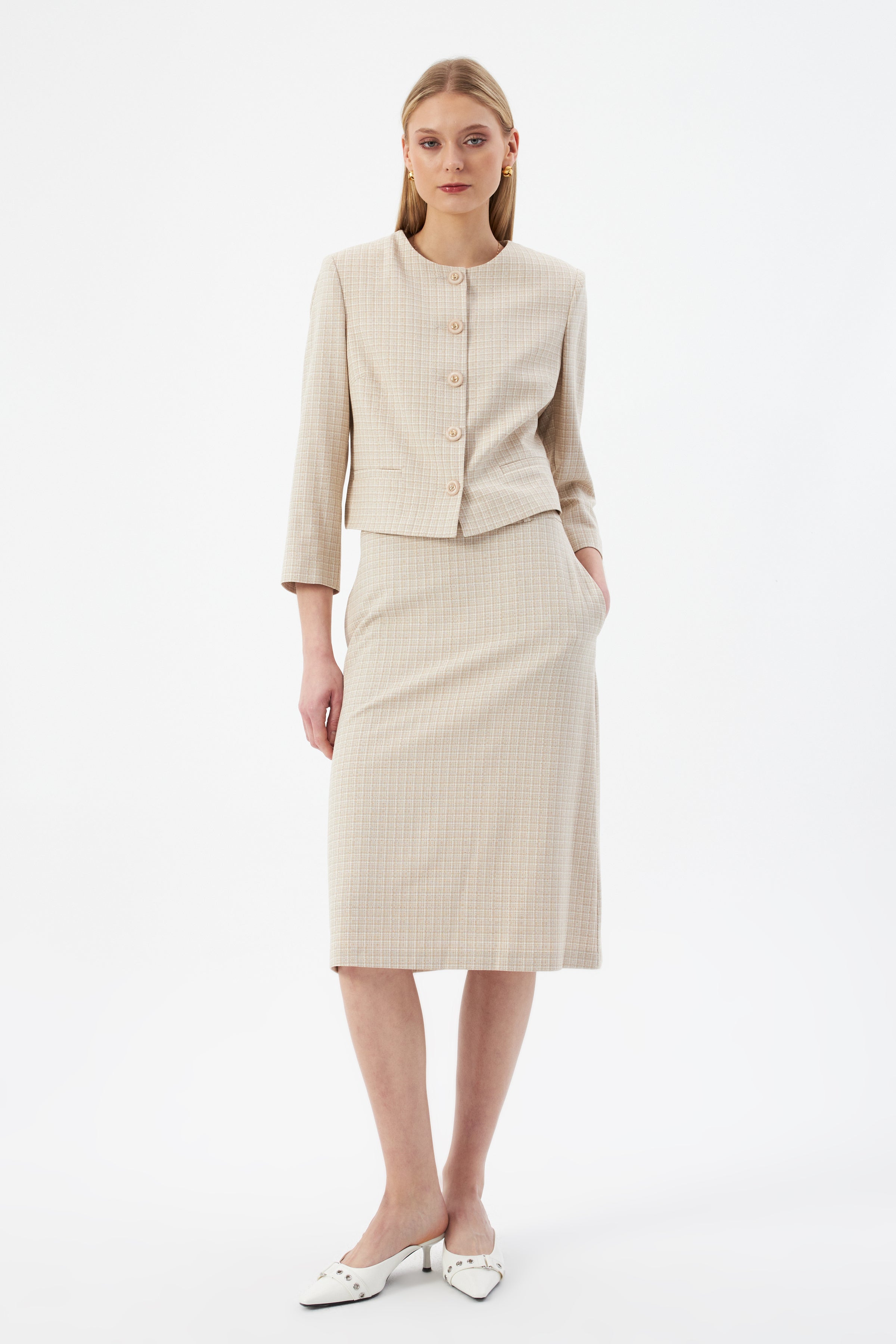 Bej Kadın Yuvarlak Yaka Düğmeli Ceket ve Midi Etek Set