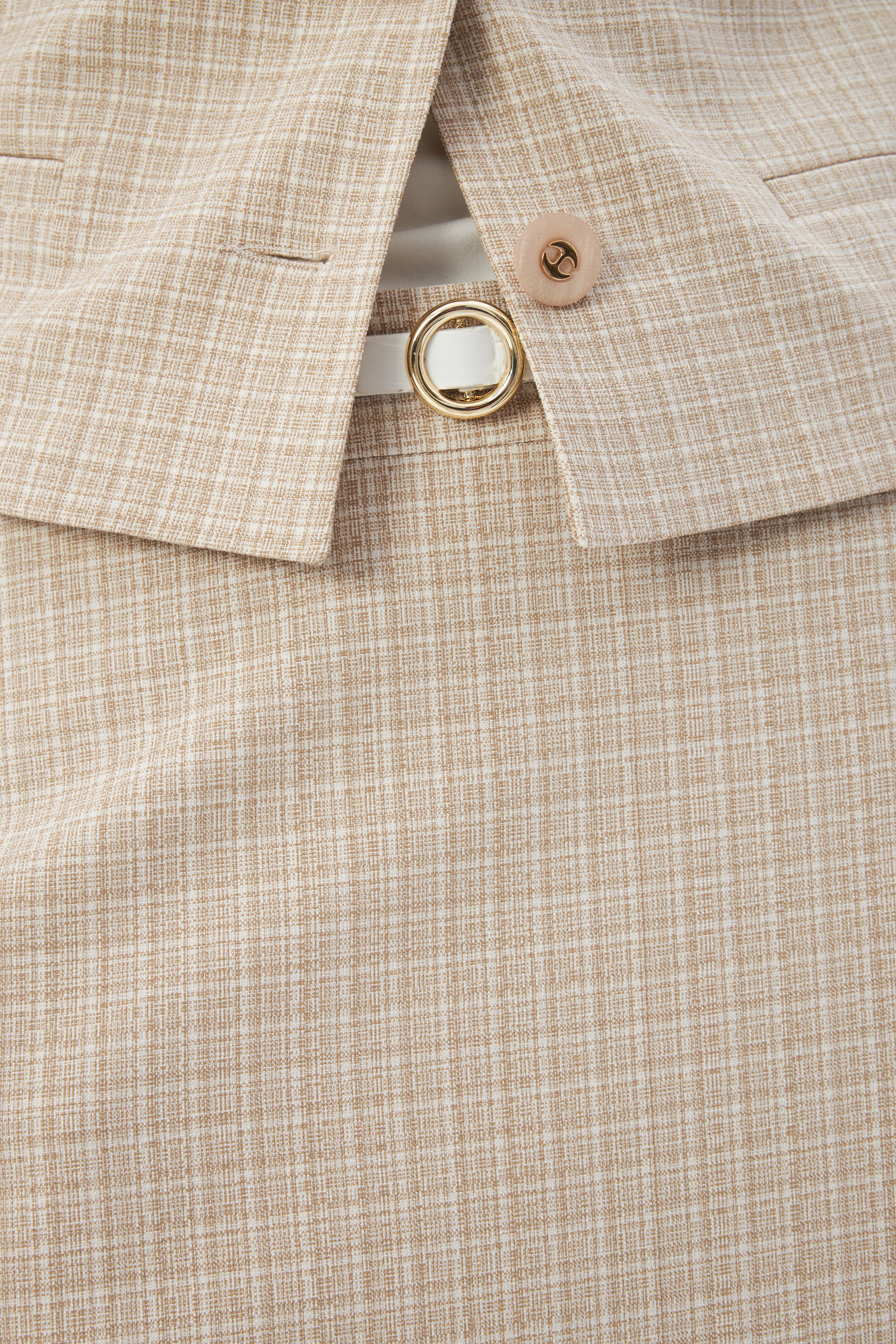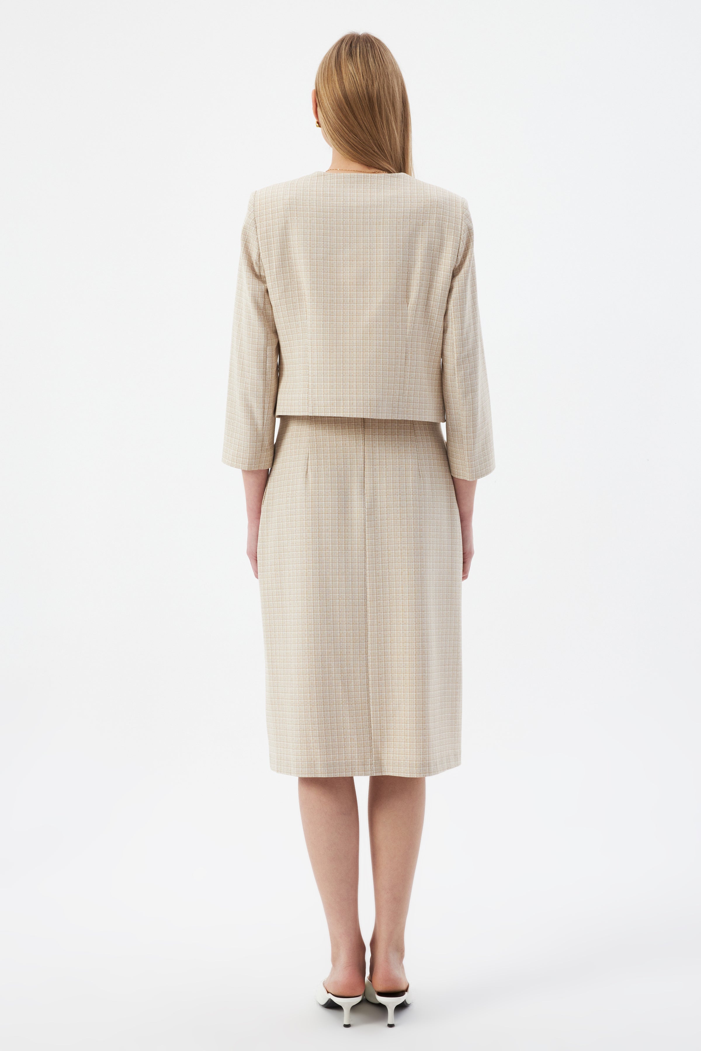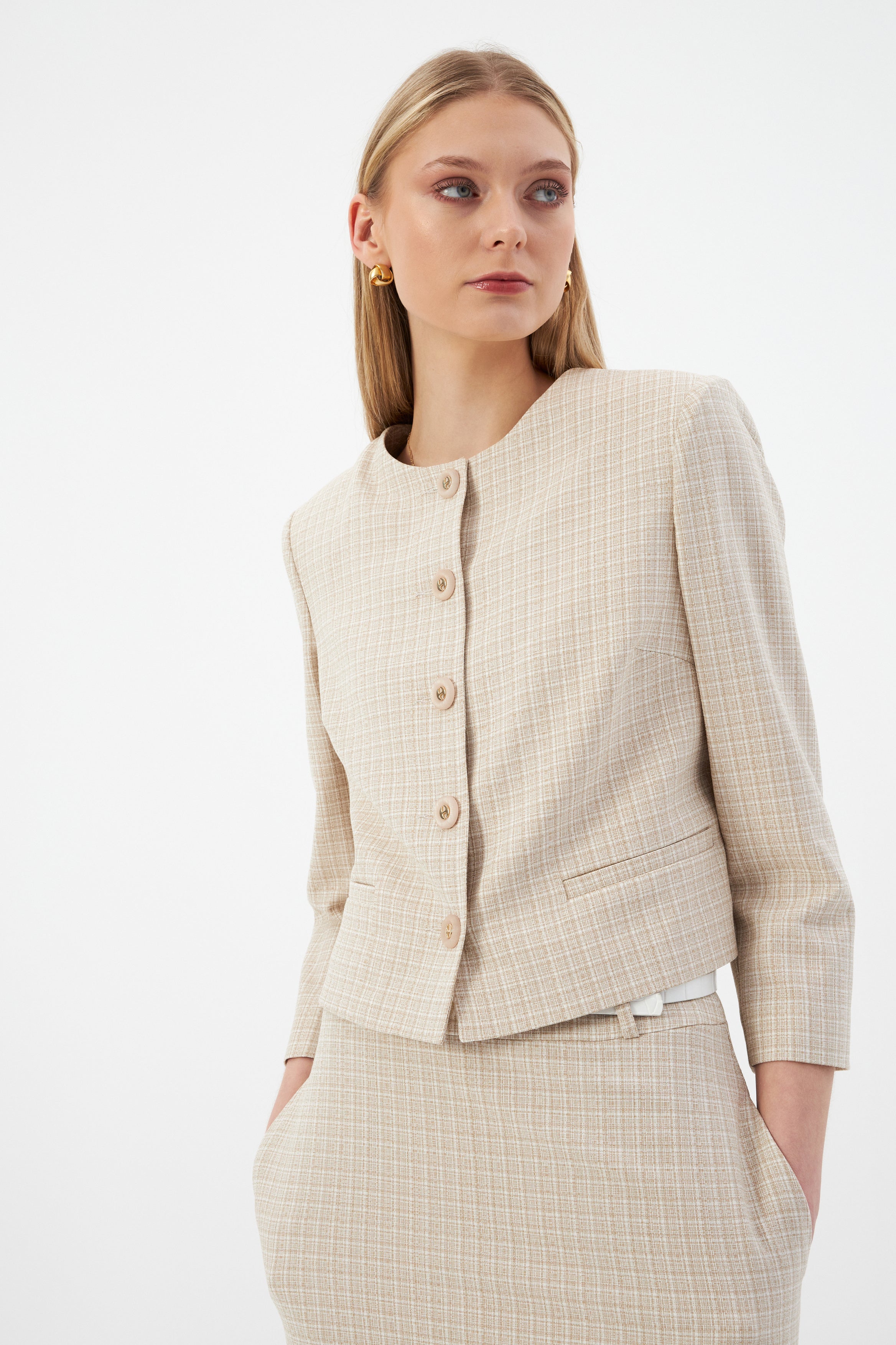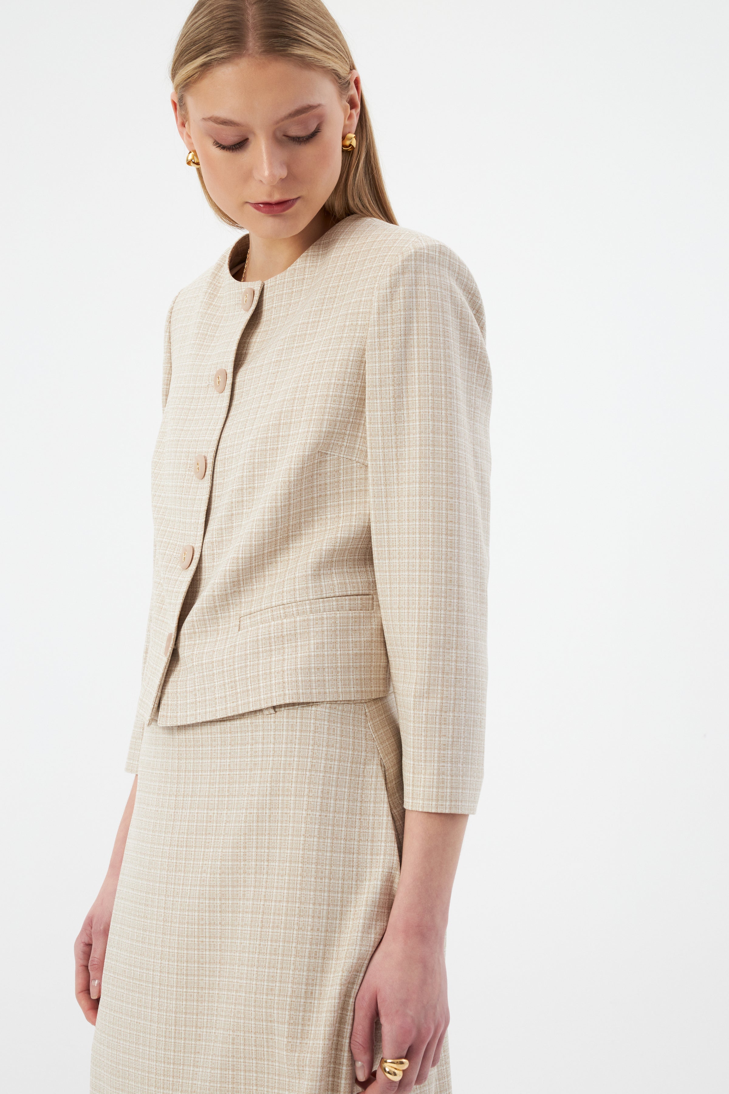 Bej Kadın Yuvarlak Yaka Düğmeli Ceket ve Midi Etek Set