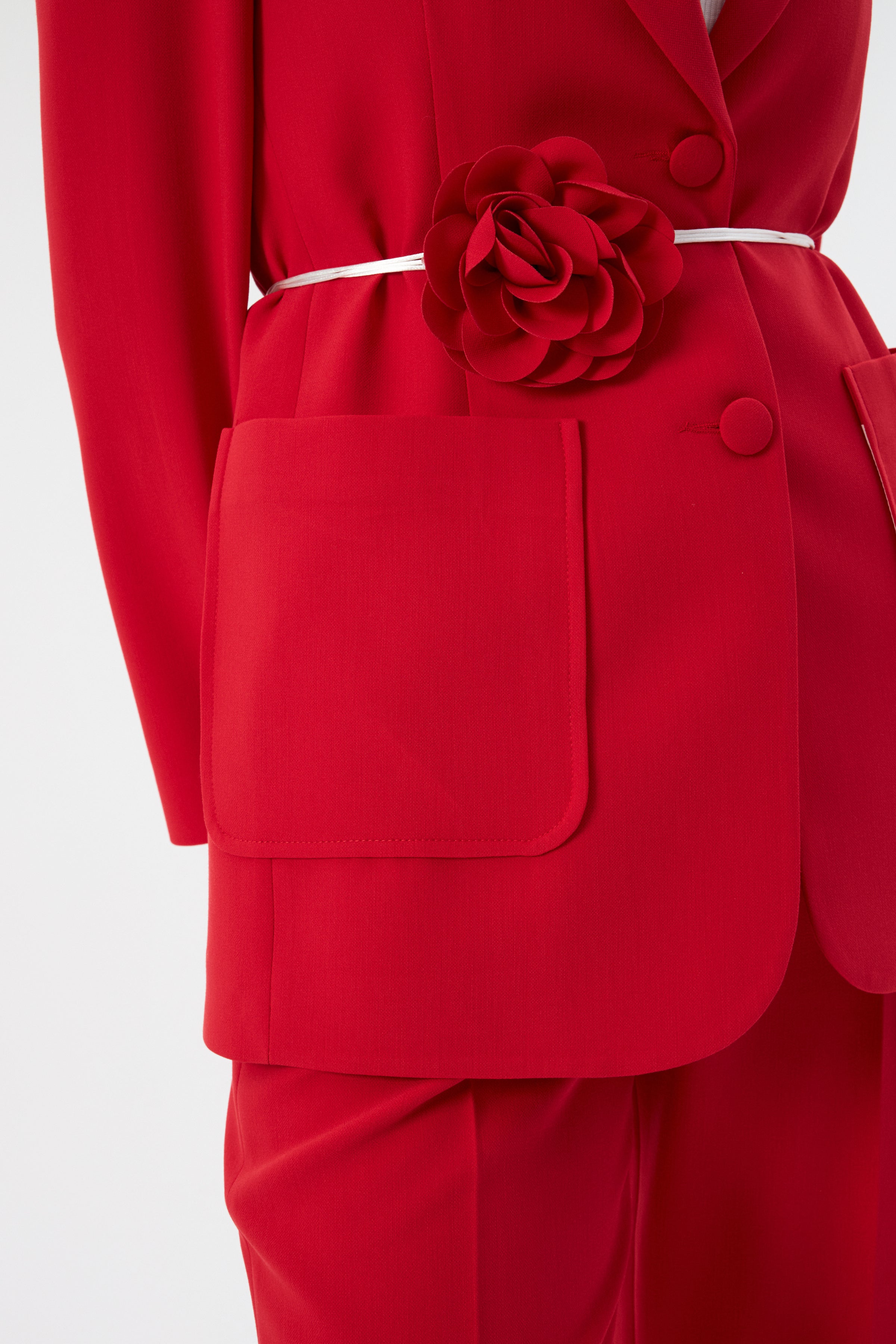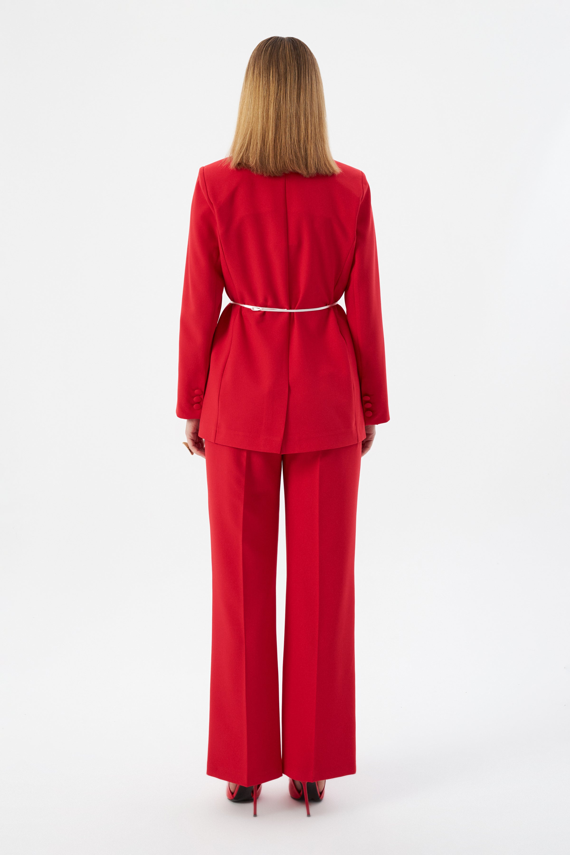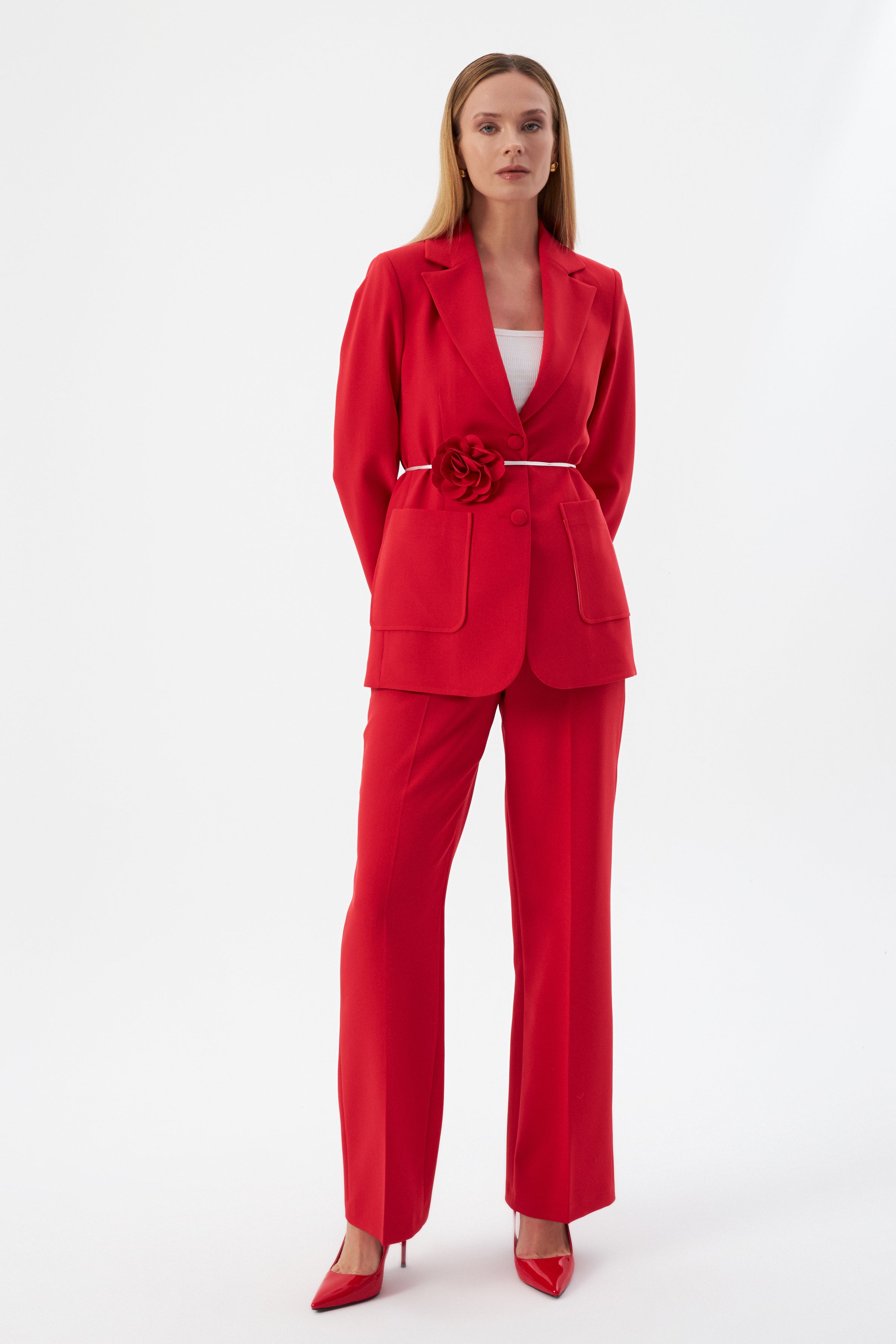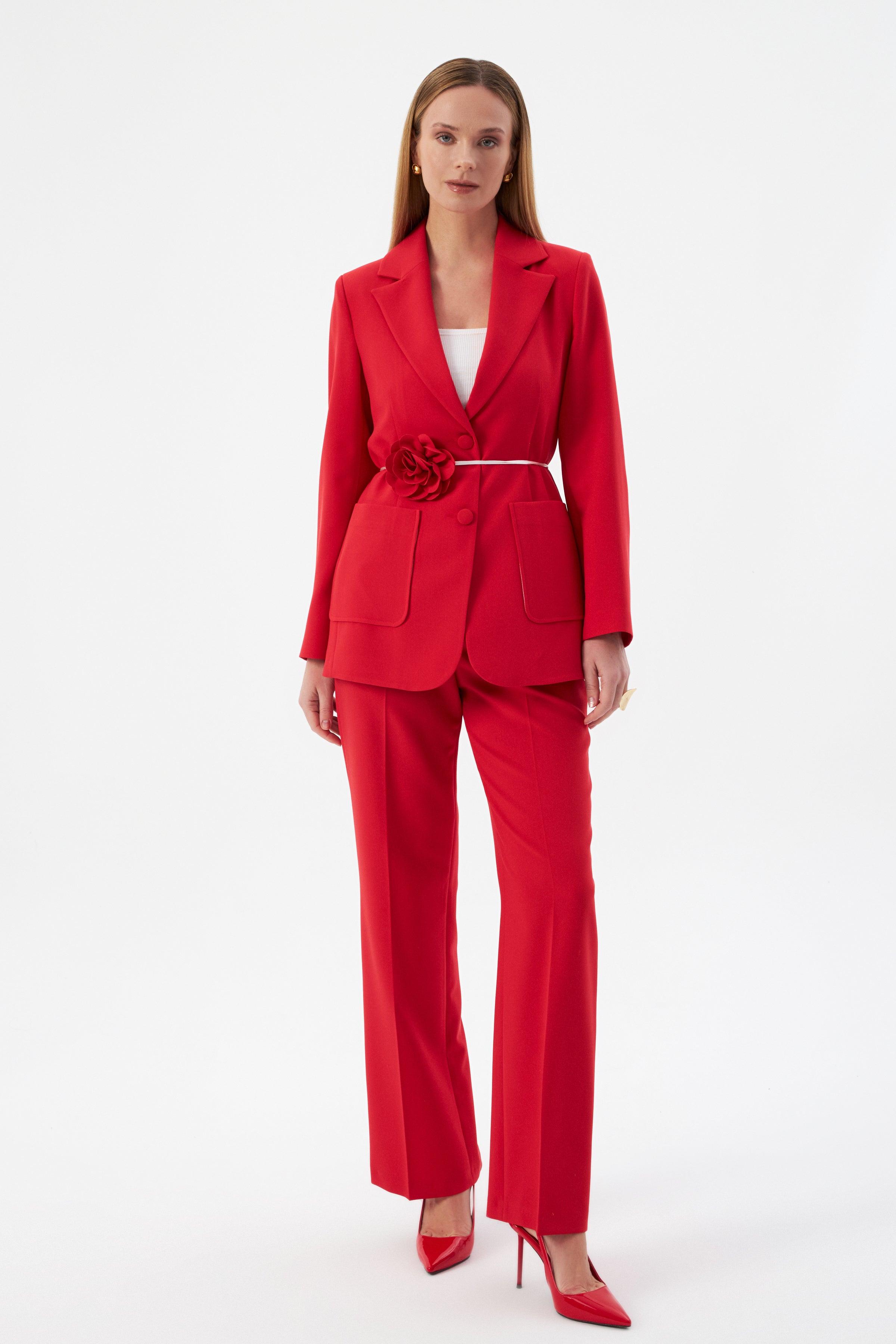 Çiçek Detaylı Kırmızı Kadın Blazer Ceket ve Geniş Paça Pantolon
