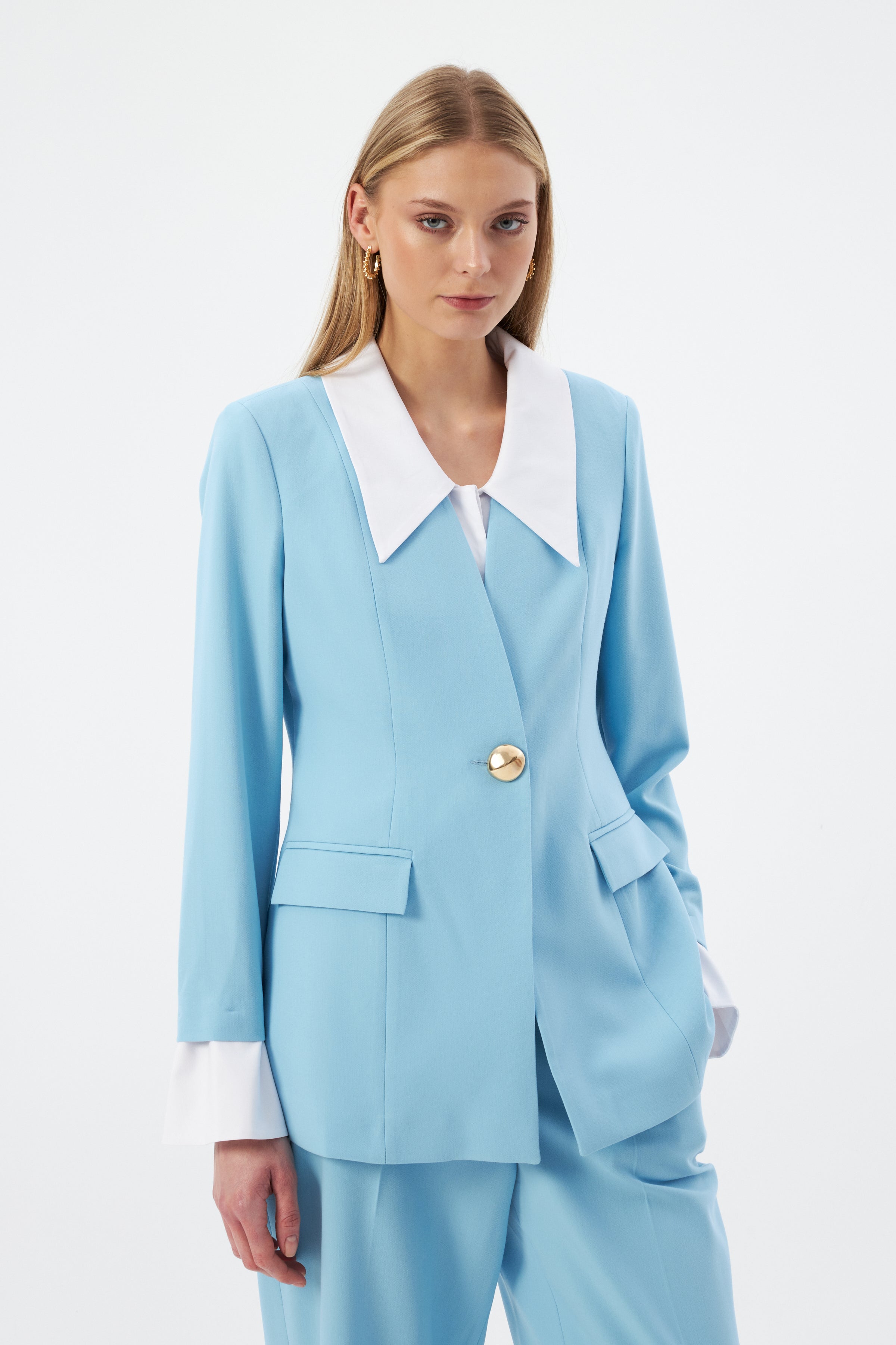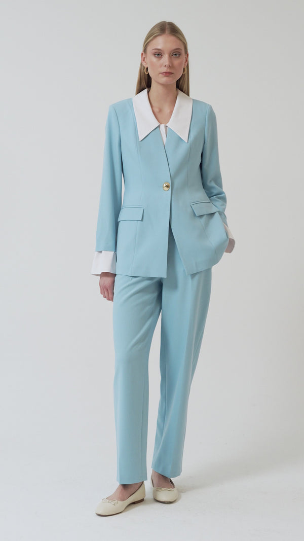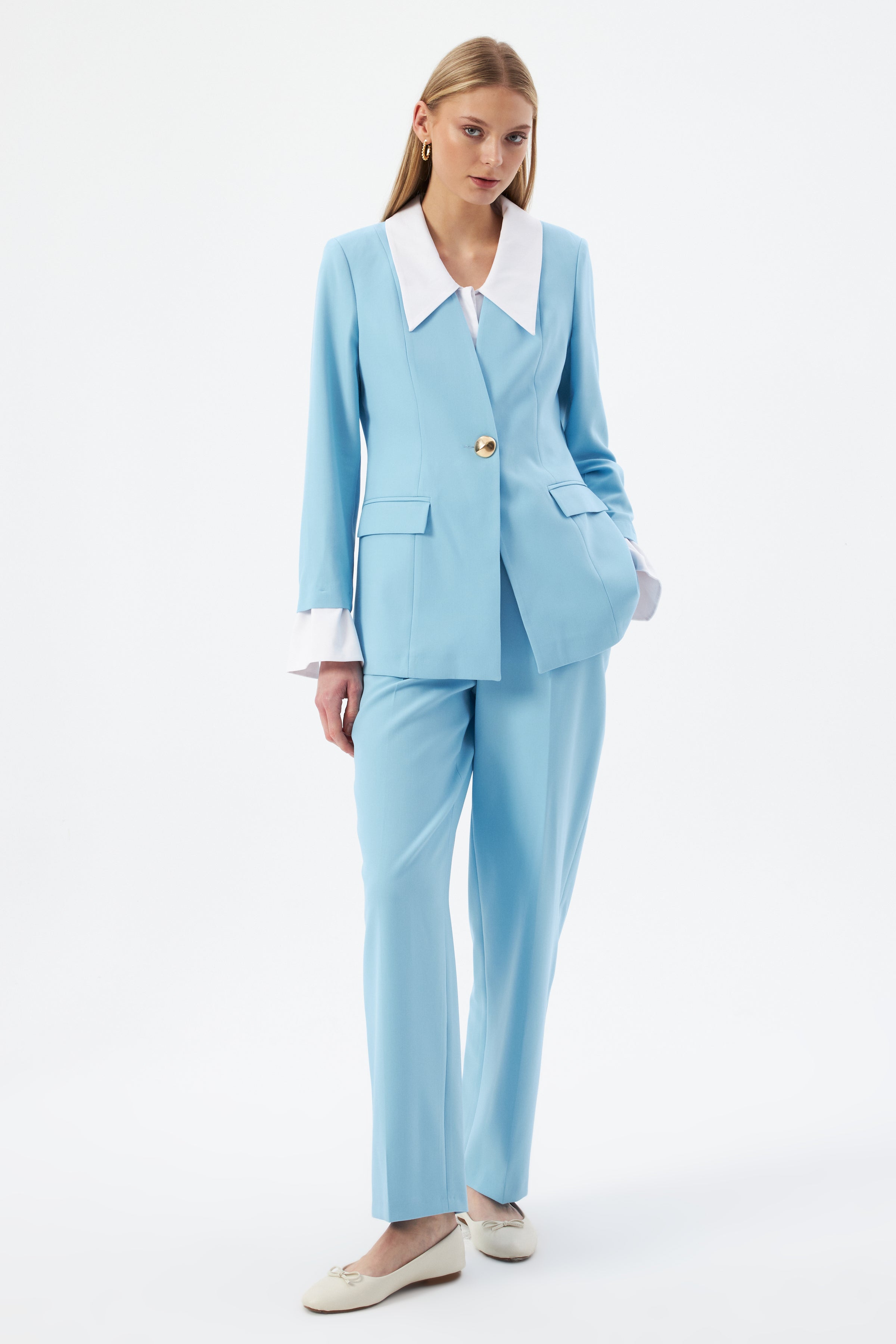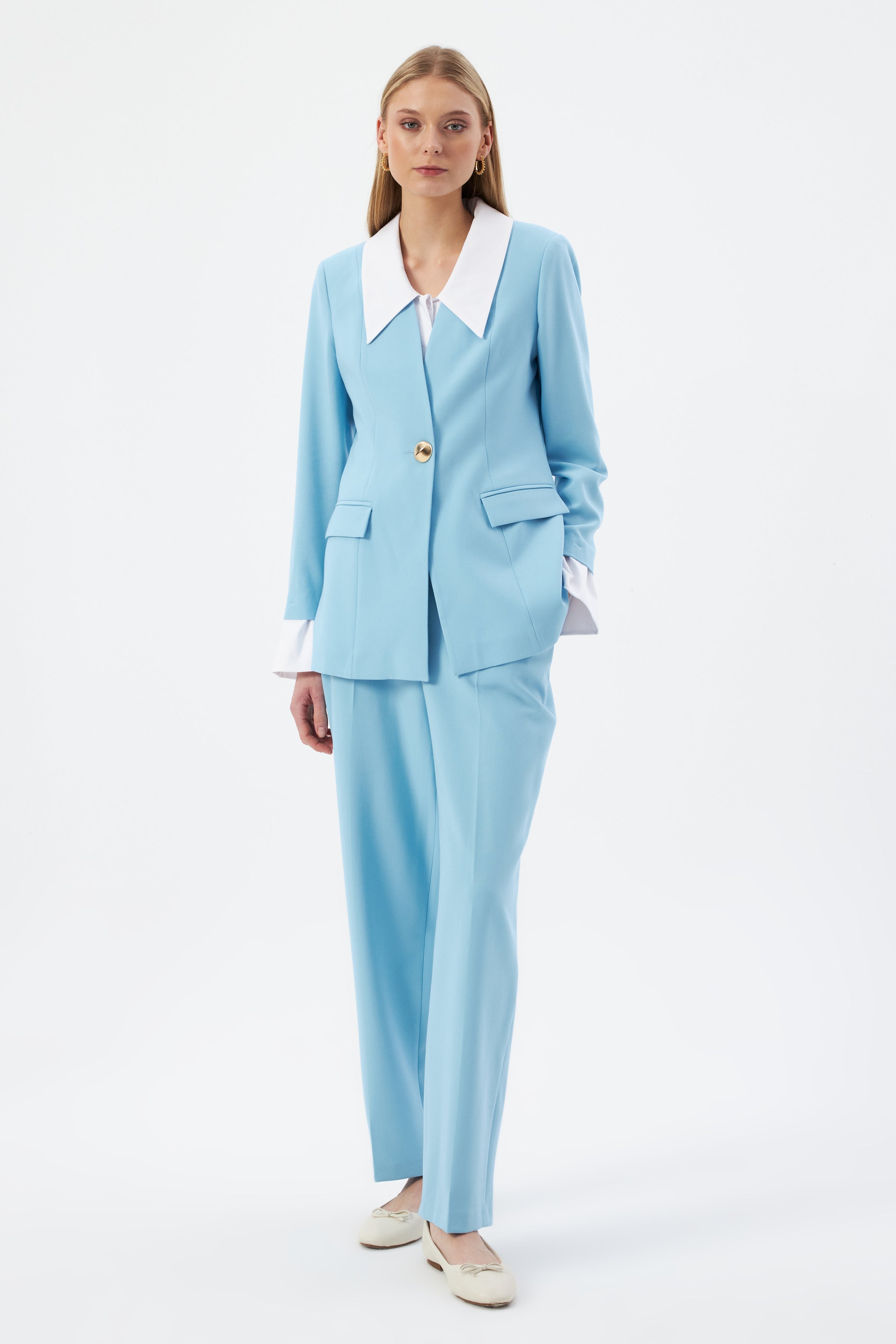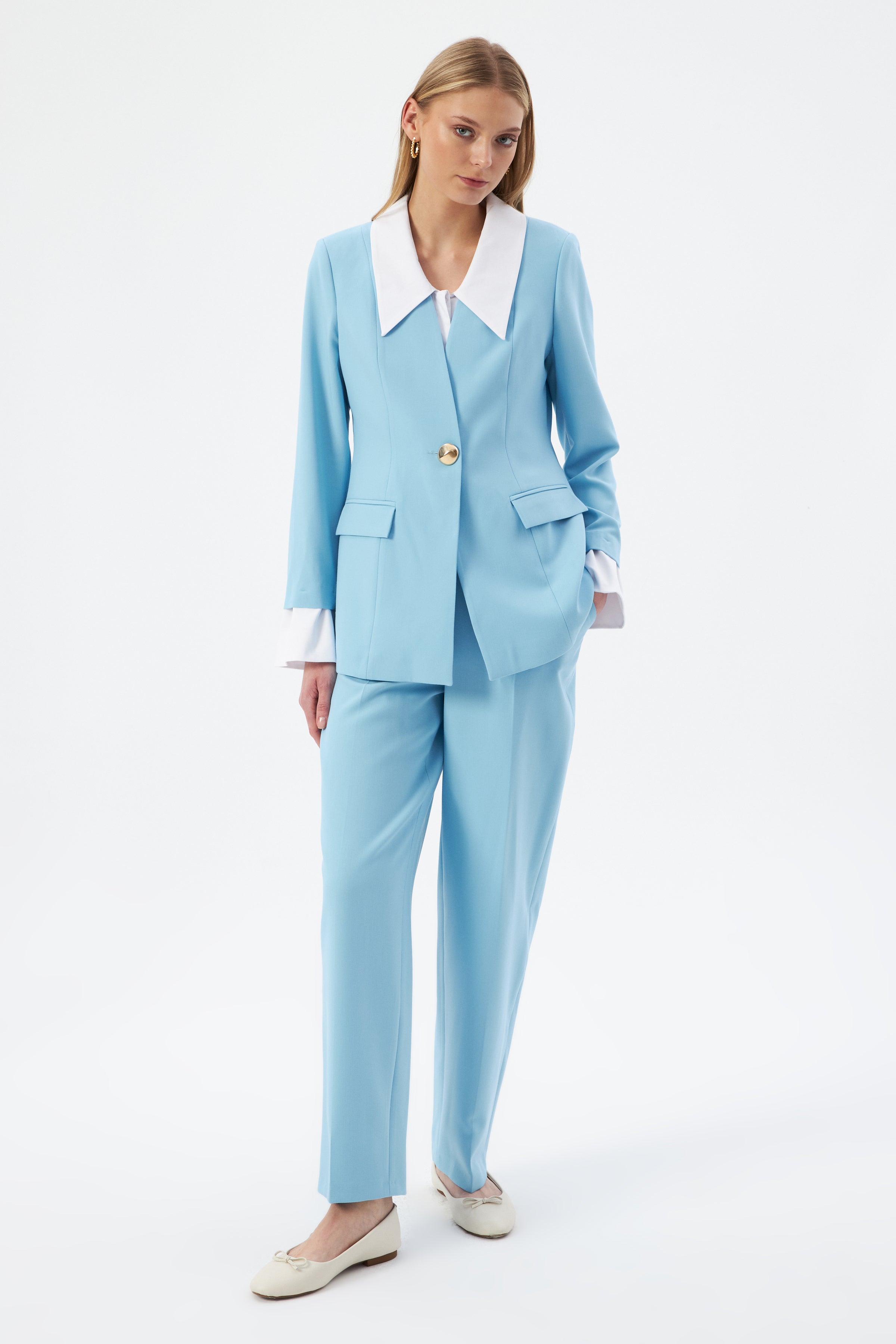 Gold Düğmeli Beyaz Yakalı Bebe Mavisi Kadın Ceket Pantolon Set