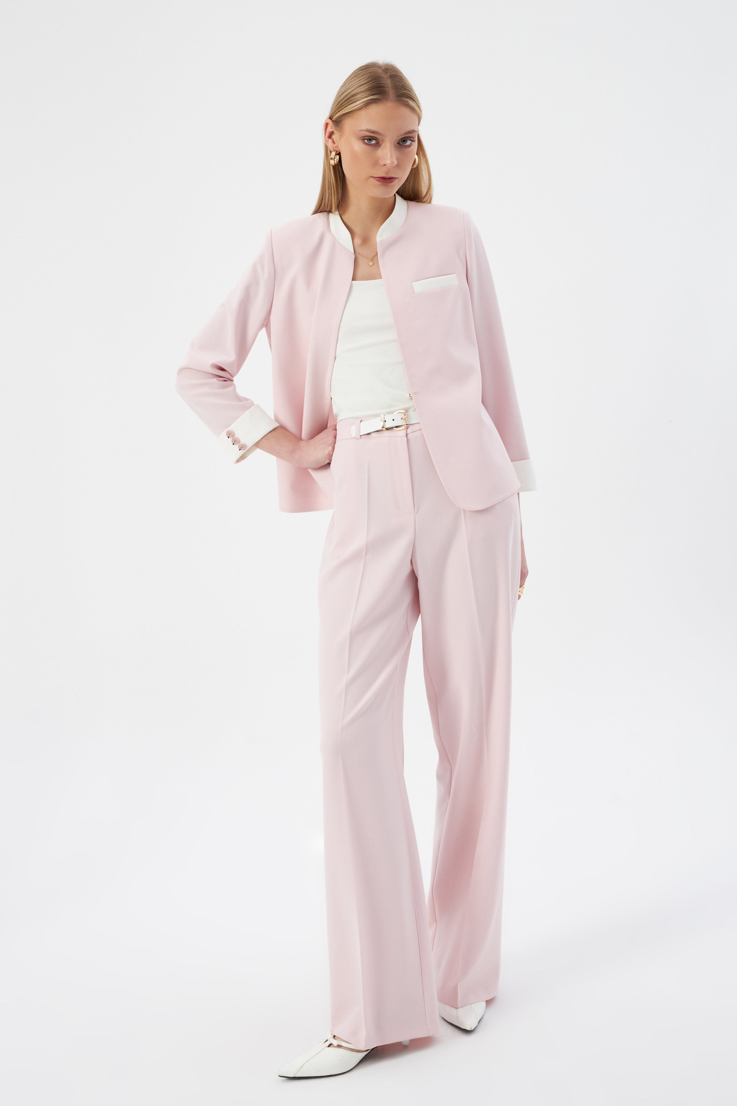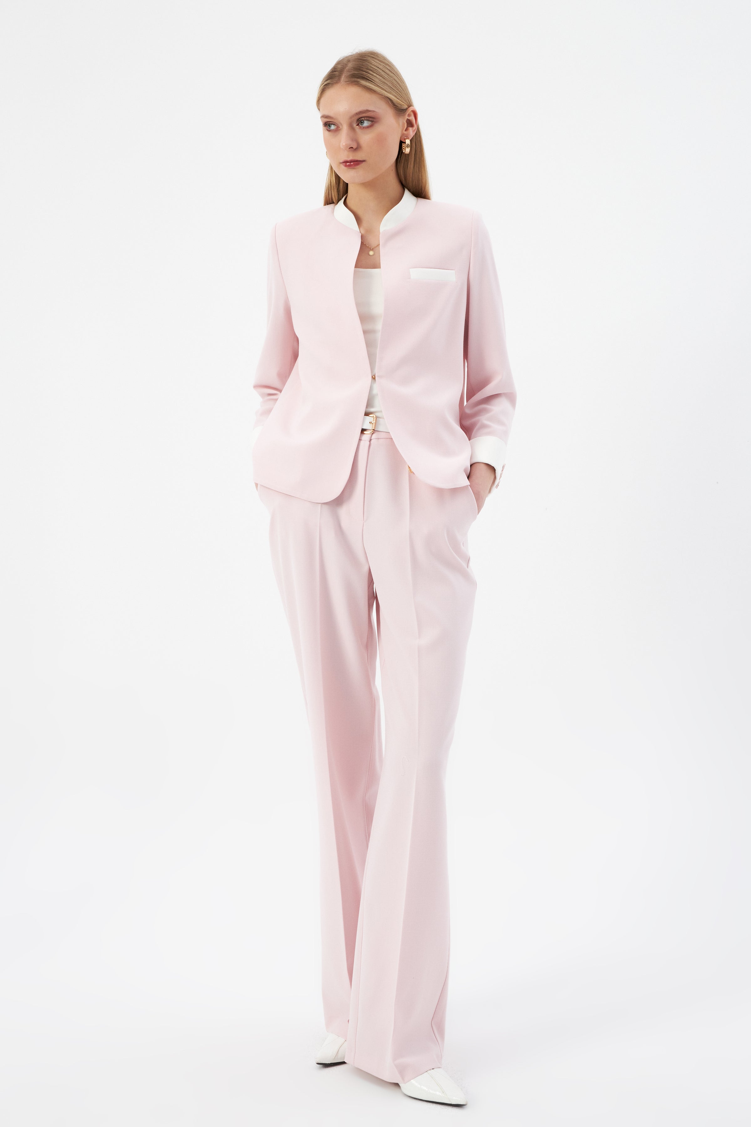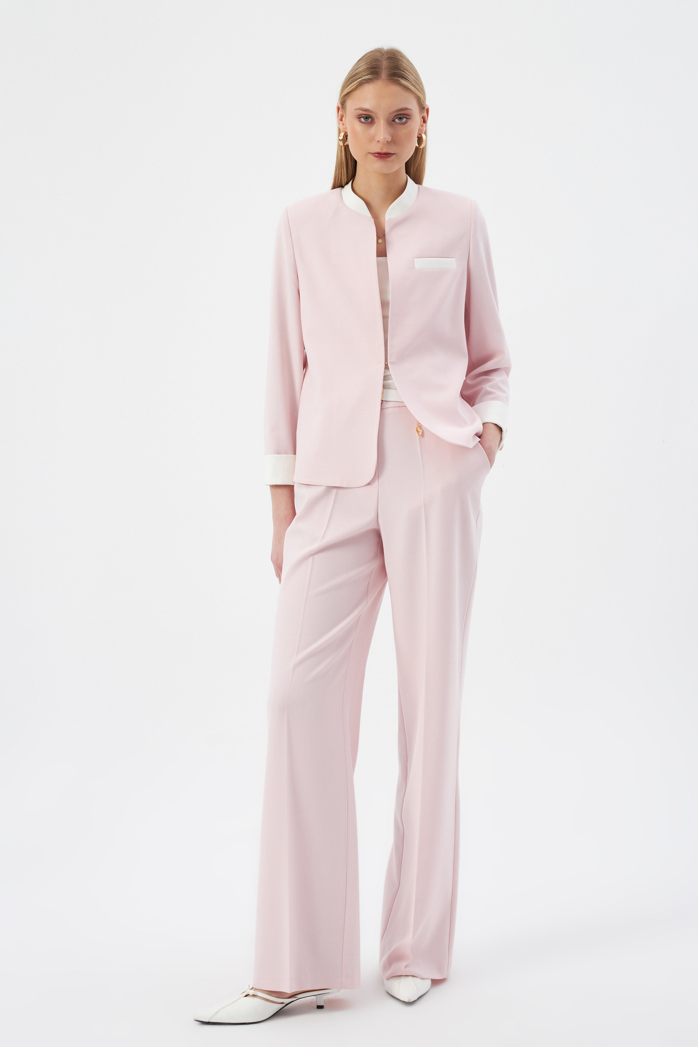 Hakim Yaka Pudra Kadın Blazer ve Bol Paça Pantolon