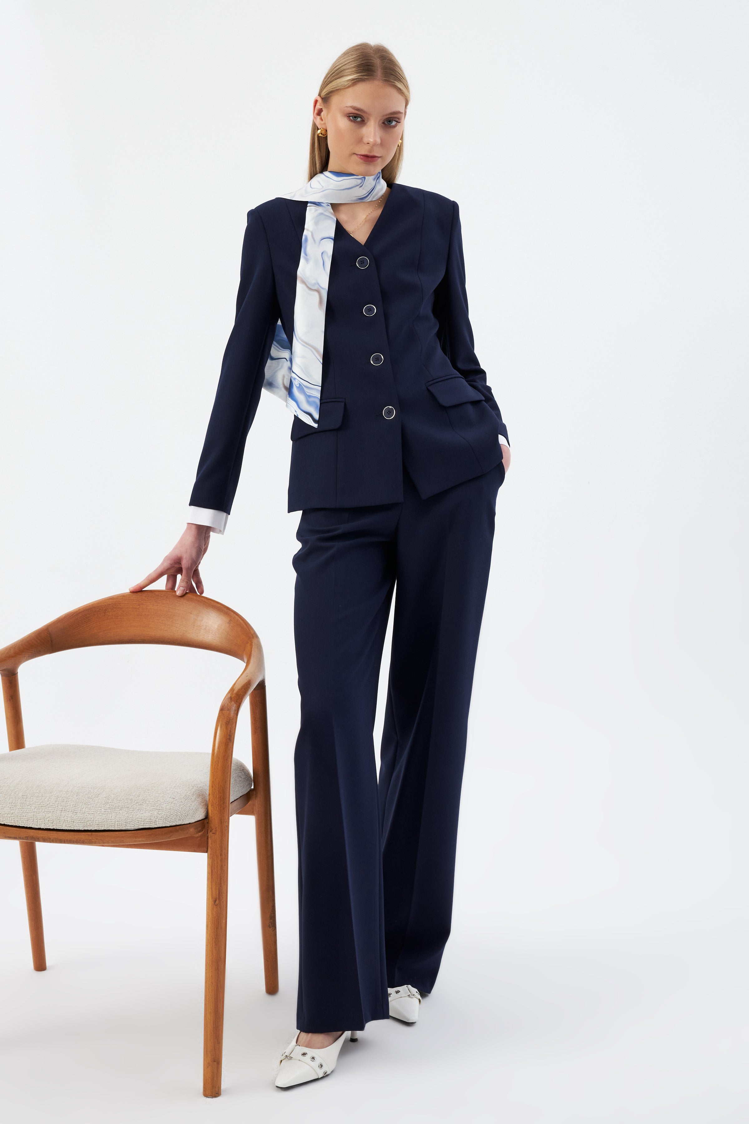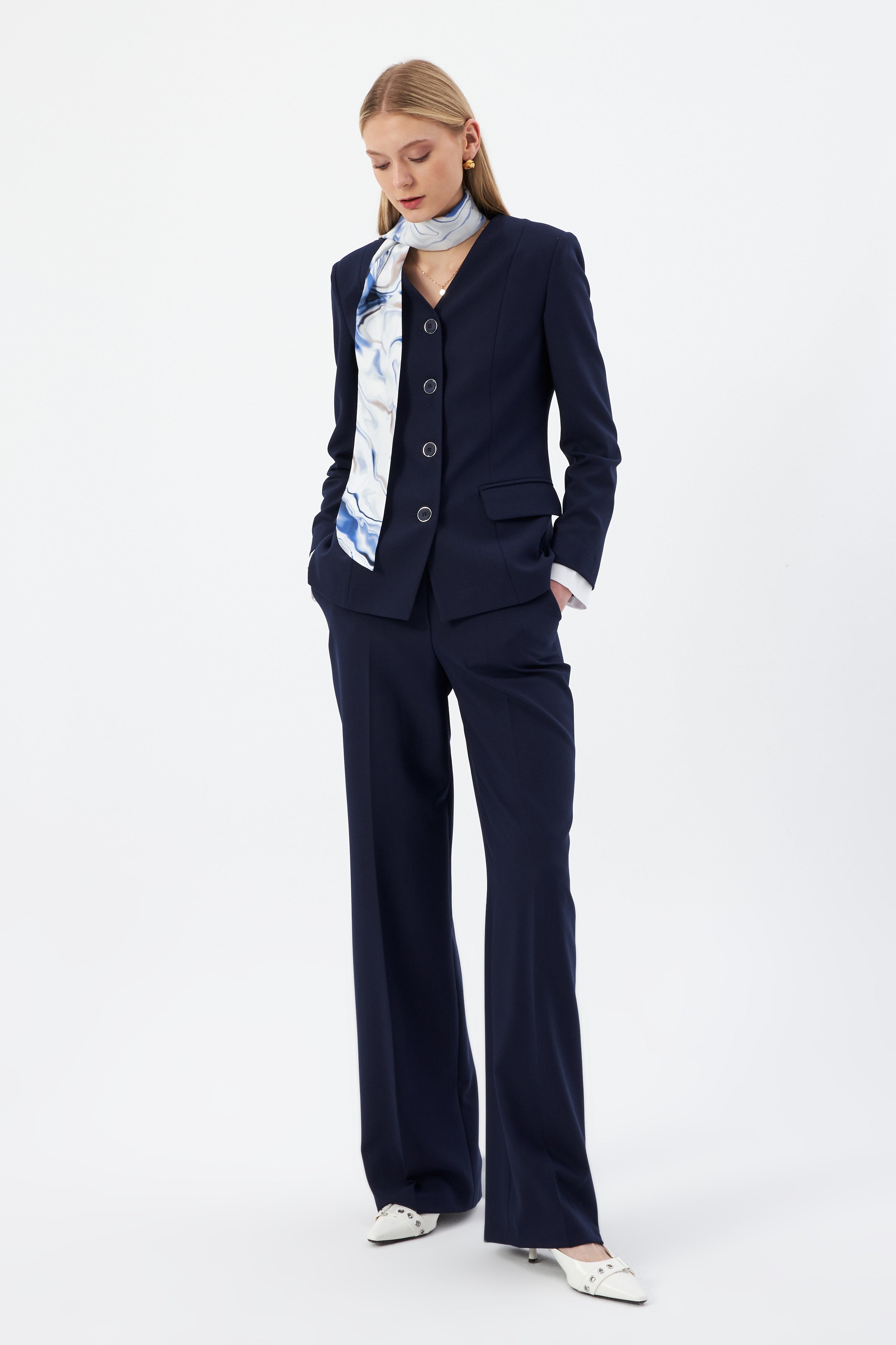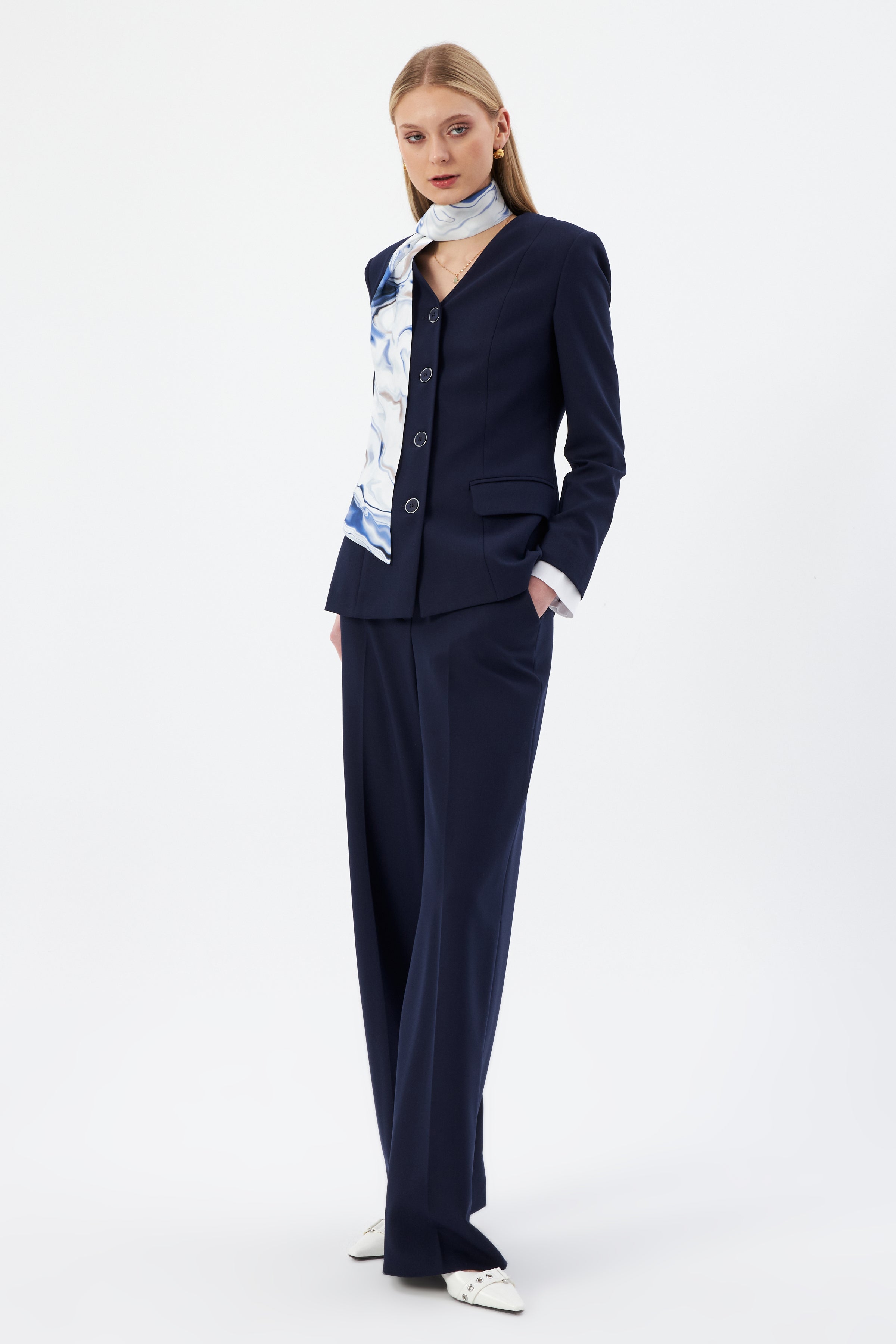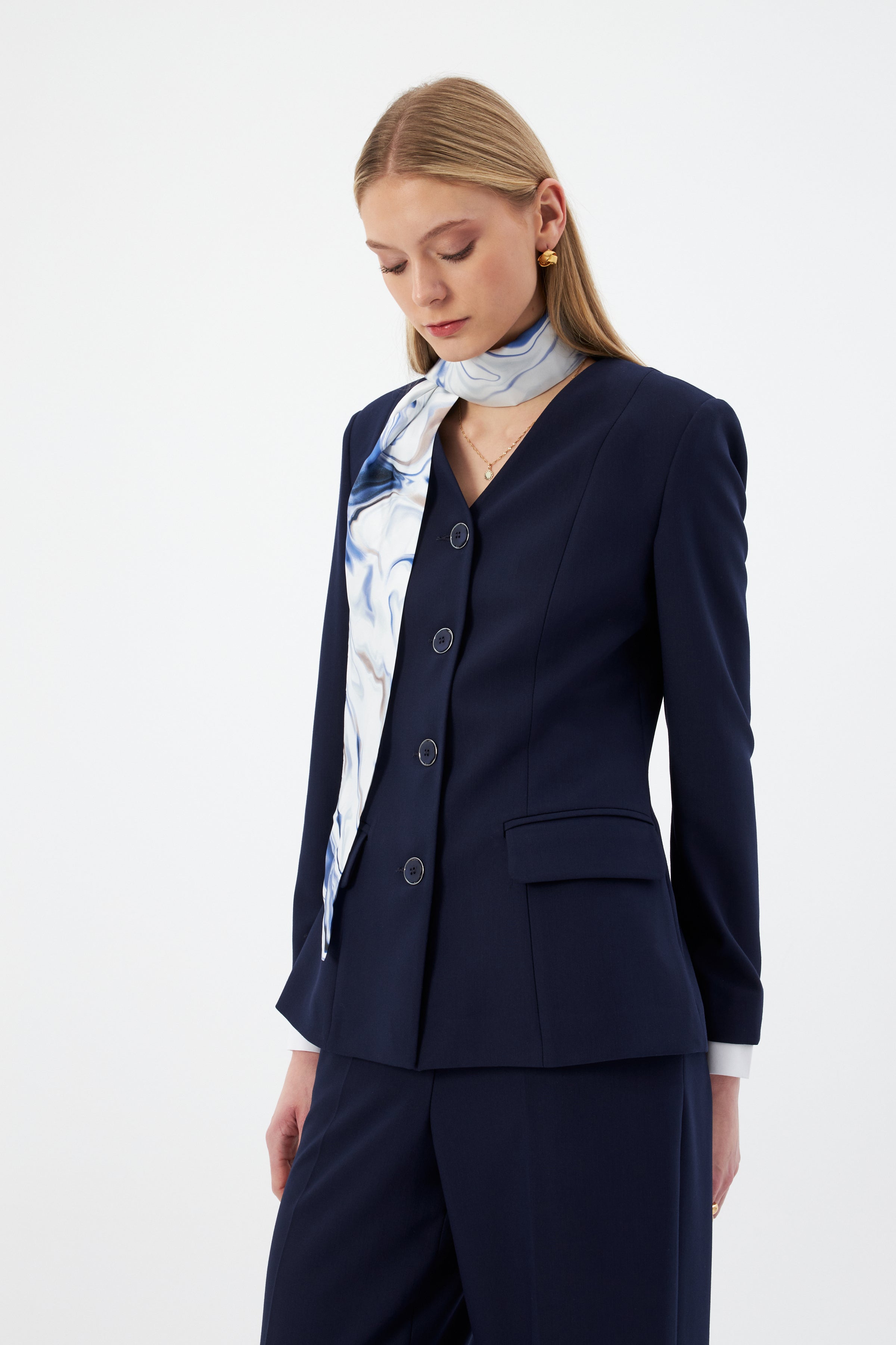 Lacivert Kadın Ceket Pantolon Takım V Yaka Düğmeli Fular Detaylı 44221