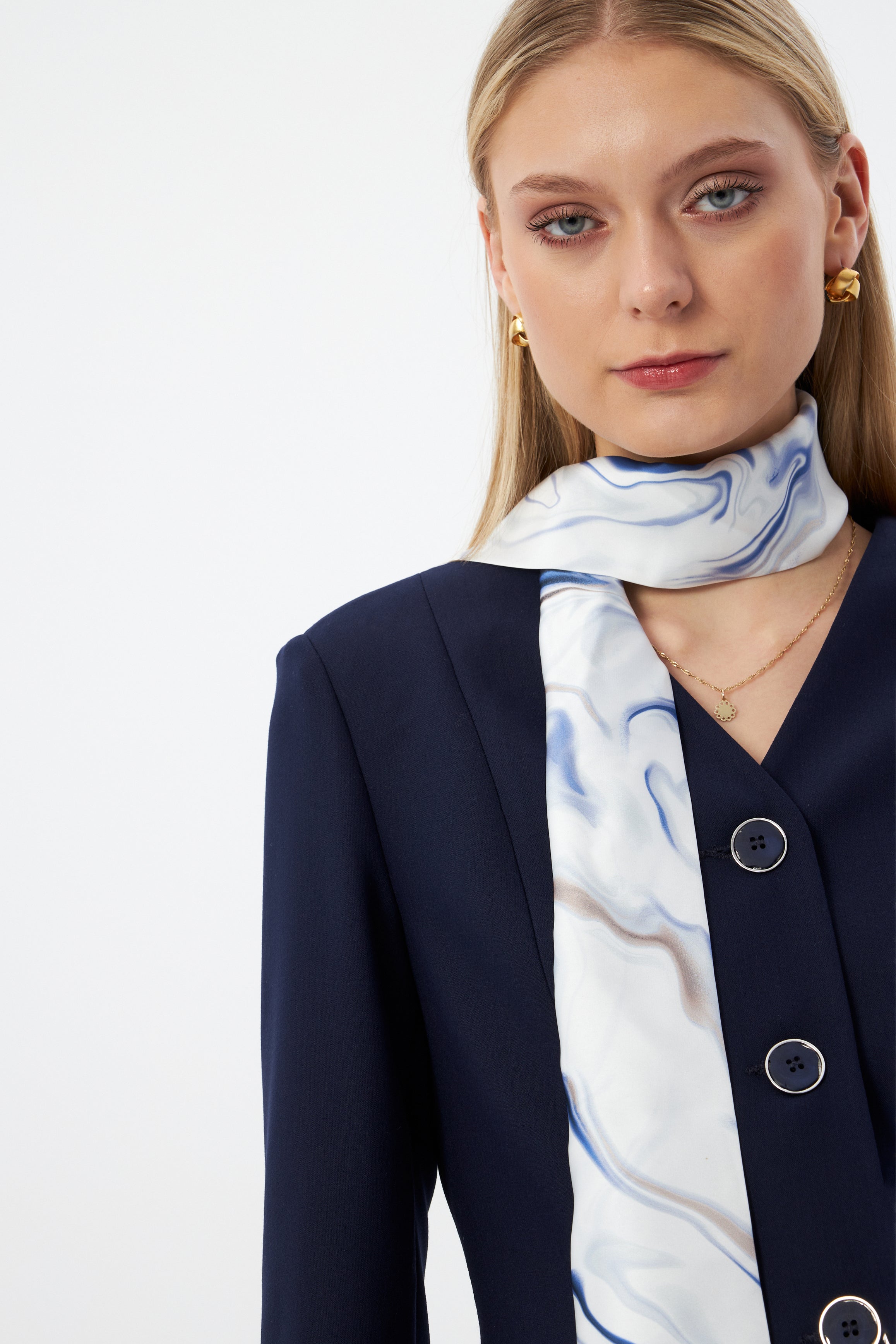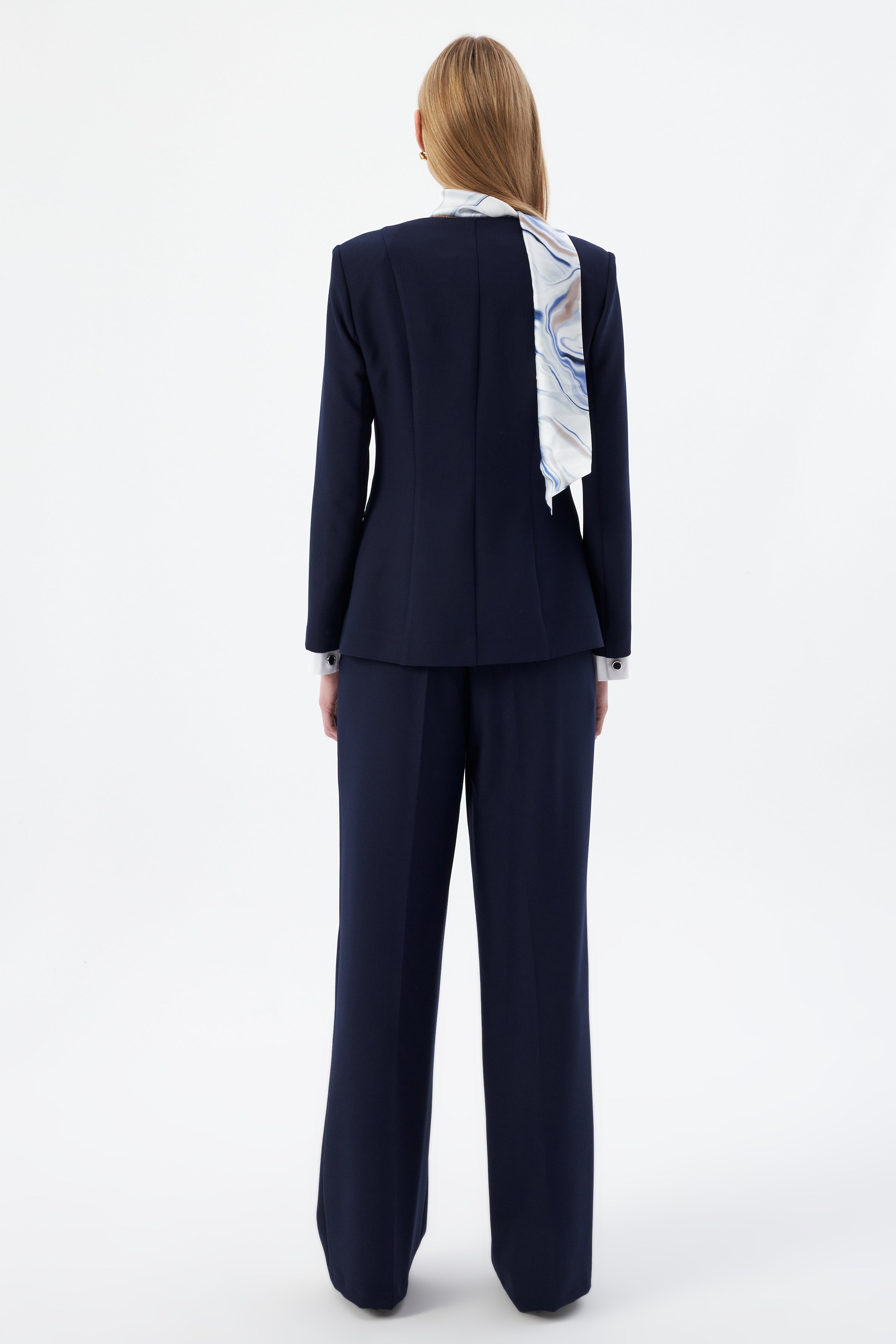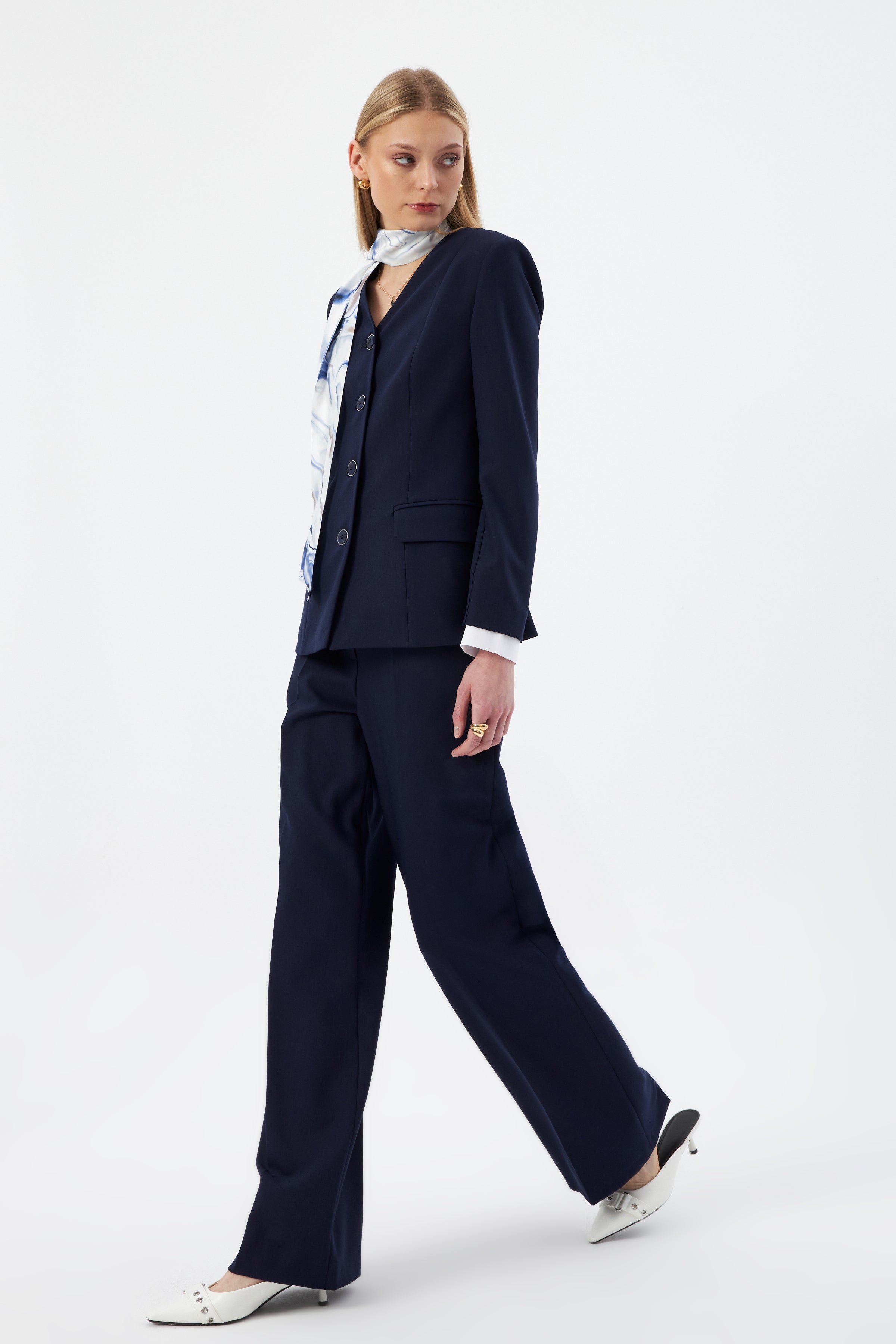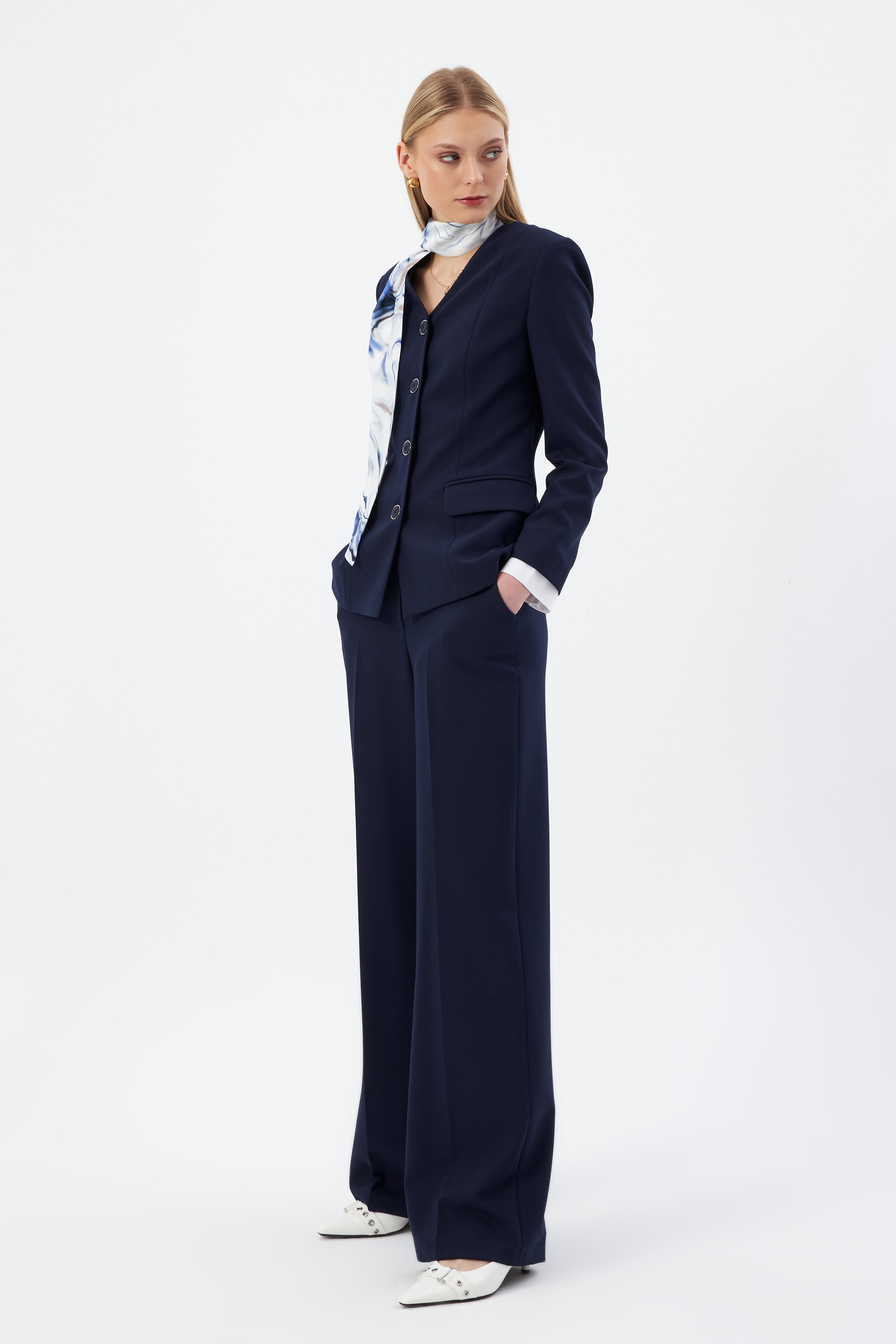 Lacivert Kadın Ceket Pantolon Takım V Yaka Düğmeli Fular Detaylı 44221